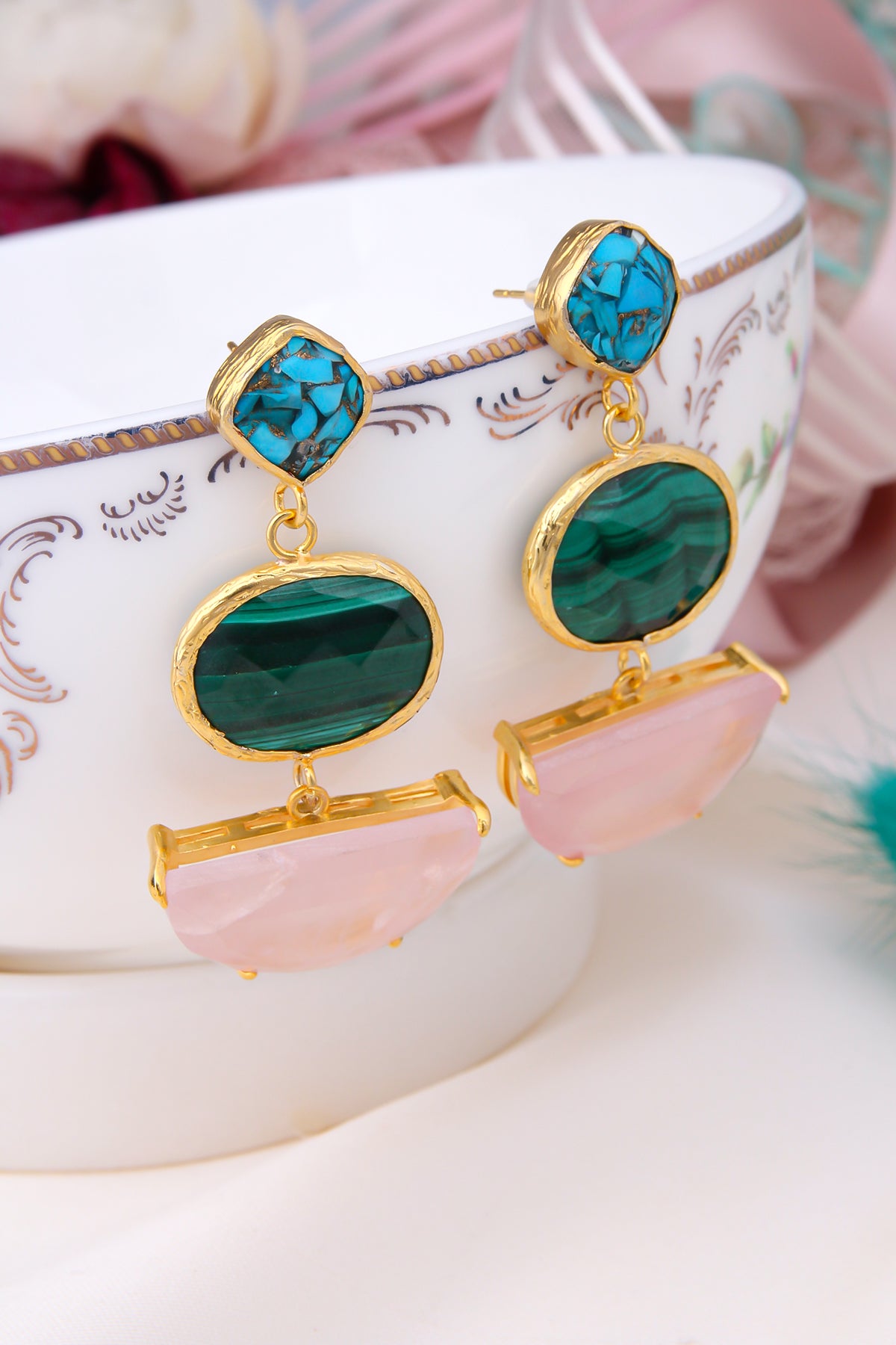 Turquoise & Malahite & Pink Quartz Boucles d'oreilles